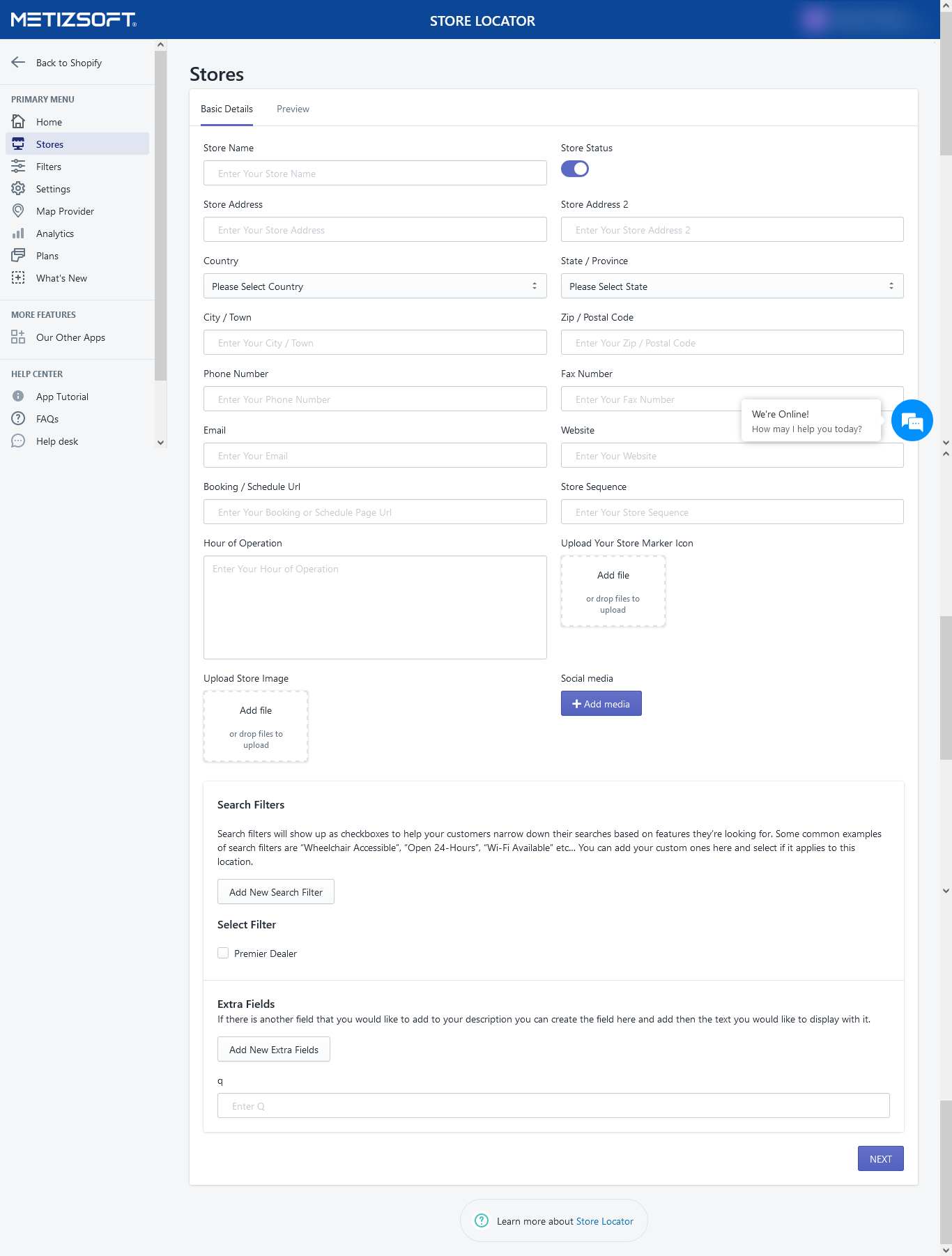 Open the Store Locator app and navigate to the Stores page. Click the Add New Store button located at the top right corner. Enter the store name and address. Then, add details such as country, state, city, zip code, phone number, email address, ...