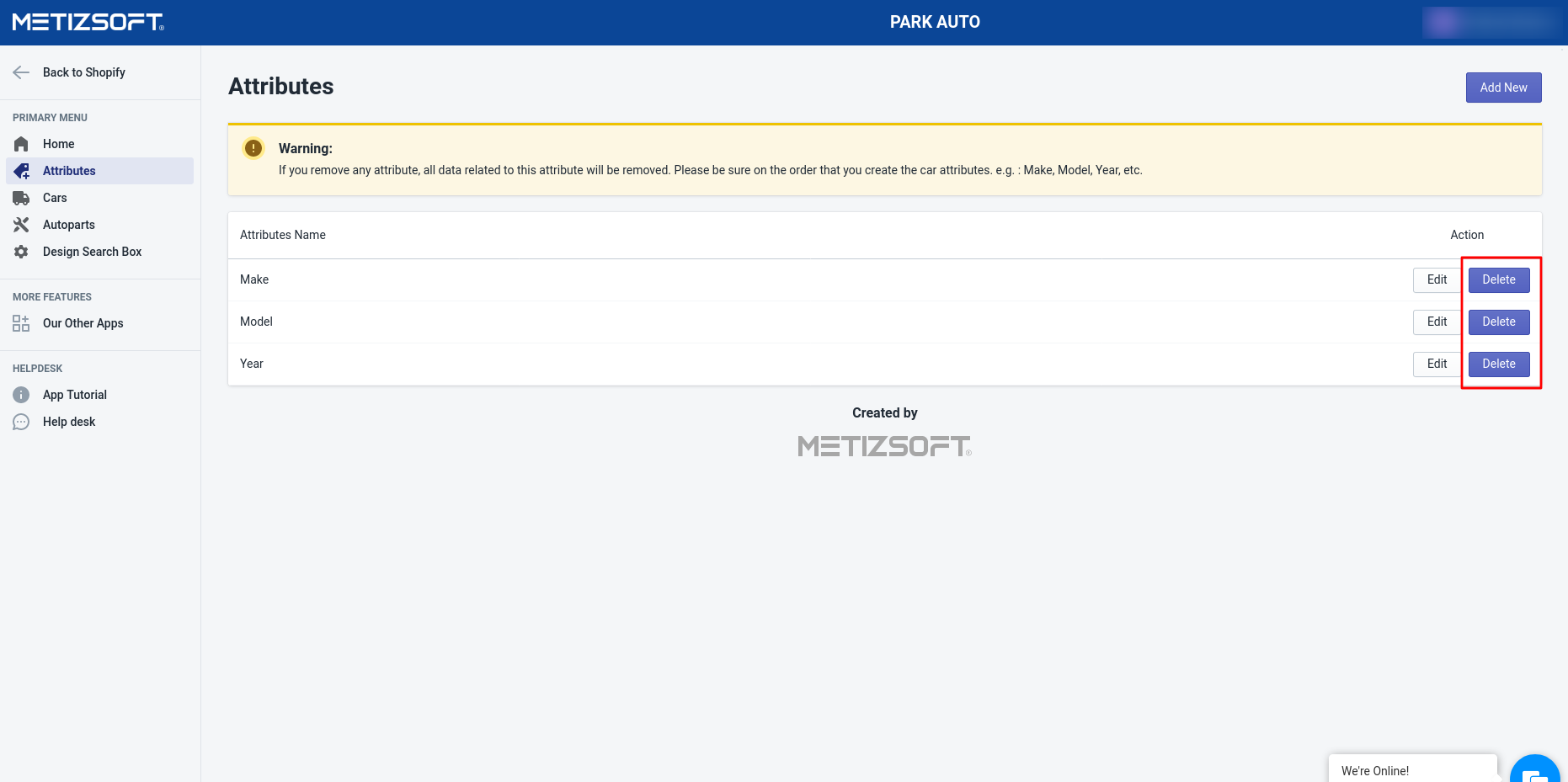 Backend / Advance Auto Parts Search app Setup - Open the Advanced Auto Parts Search App and navigate to the Attributes page. - Click the Add New button on the right side. - Enter the name of the attribute and click Save. Note: Create attributes for ...