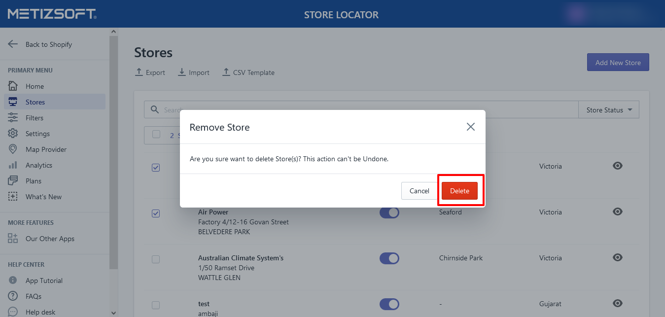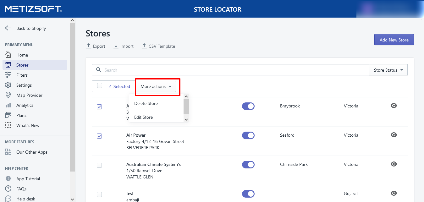 Open the Store Locator app and navigate to the Store's page. Select the stores/locations that you want to delete. After selecting the stores, click on the "More actions" button. Click on "Delete Store" to remove the selected stores. Again, click on ...