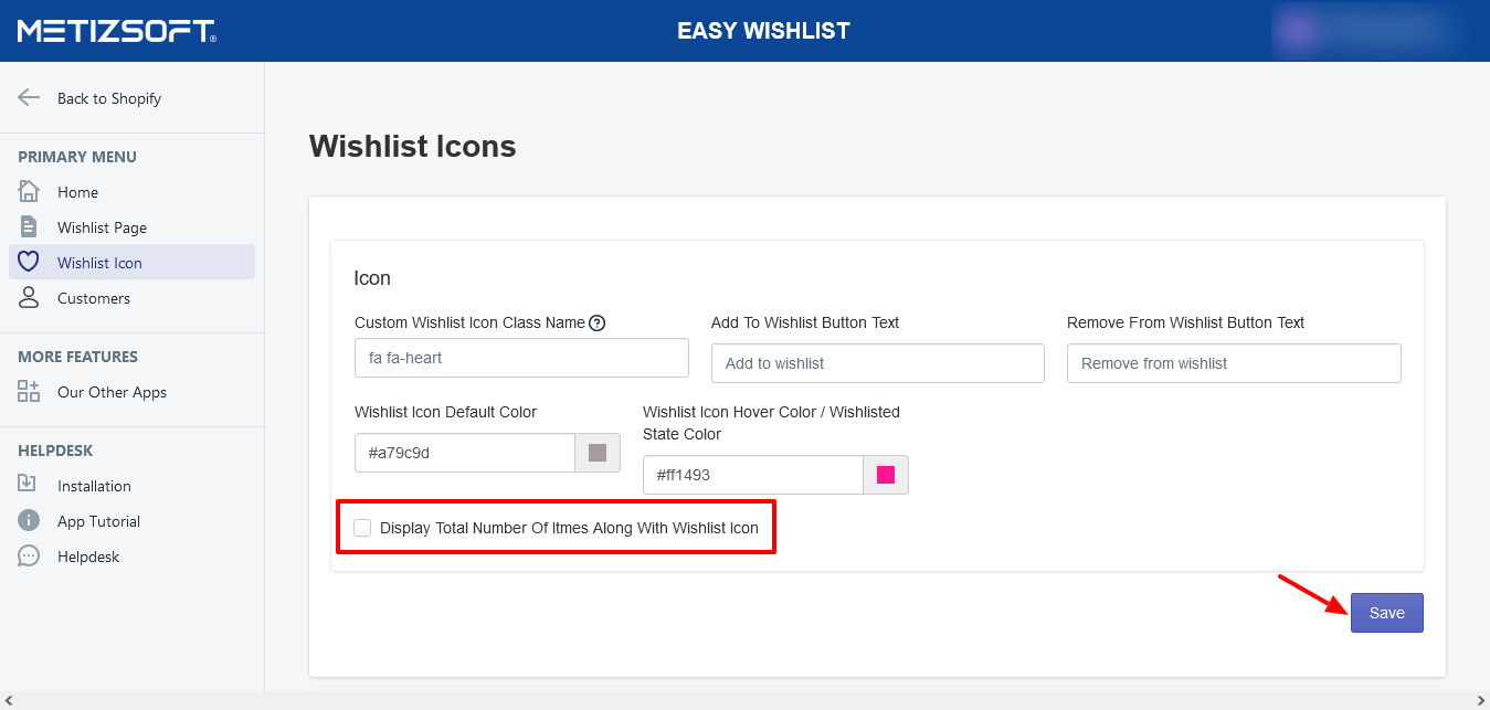 Open the Wishlist App and Go to the Wishlist Icons page Change Wishlist Icon "Default Color" and "Wishlist Icon Hover Color / Wishlisted State Color." Then click on the Save button.