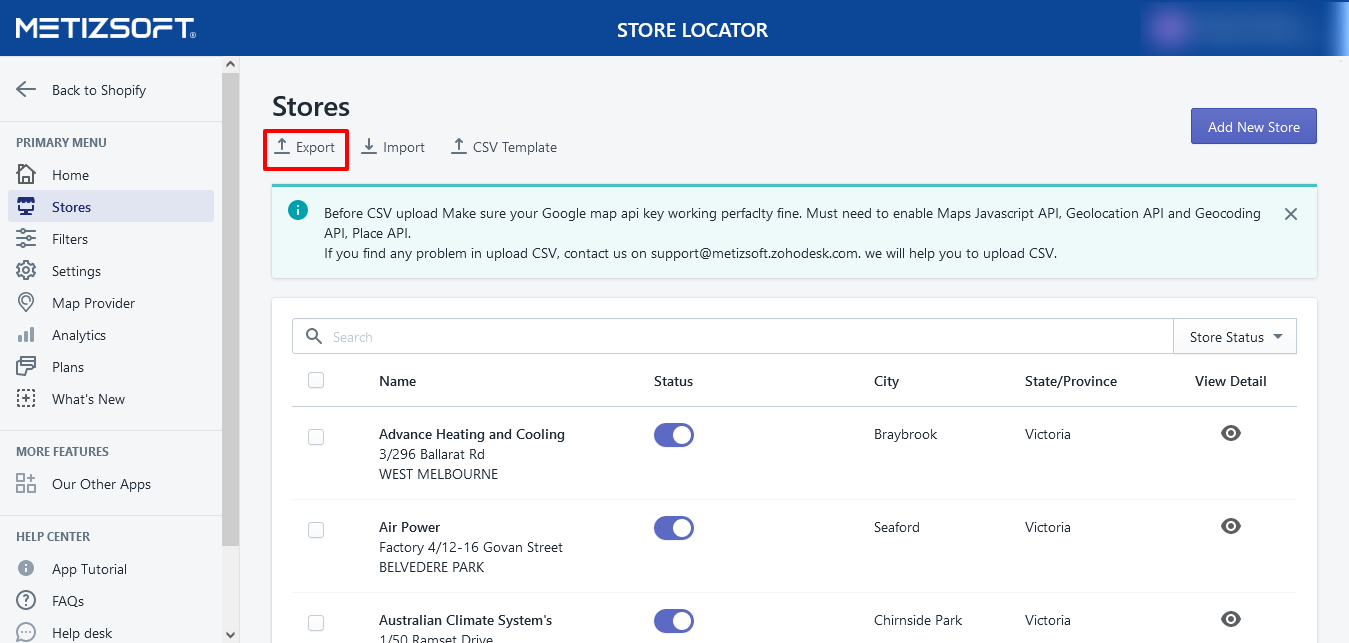 Open the Store Locator app and navigate to the Stores page. Click on CSV Template to download a sample file for importing stores. Open the CSV template file and enter the required details such as Store Name, Address, Country, State Name, and Zip ...