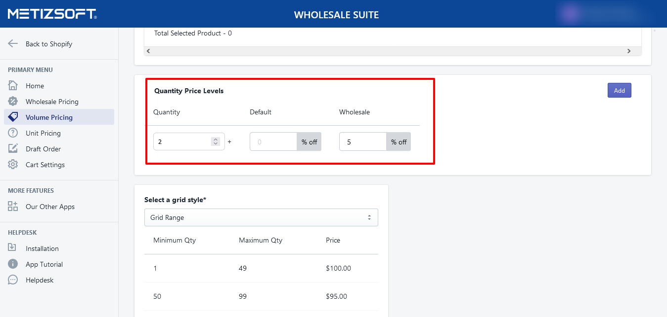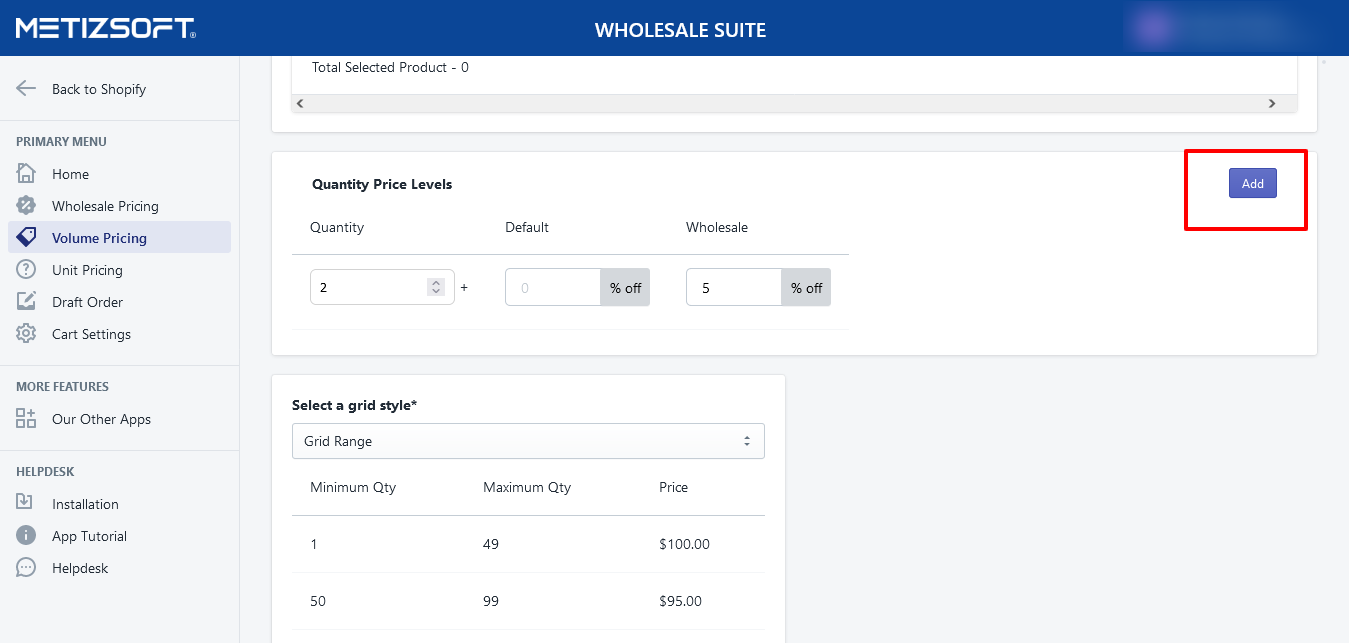 Go to the Wholesale Suite app and Go to "Tier discount" under "Wholesale Pricing". Click on the "Create Discount Tier" button on the right side. Then enter the "Tier Discount Name", select custom "Calculation Type". Then select the content you’d like ...