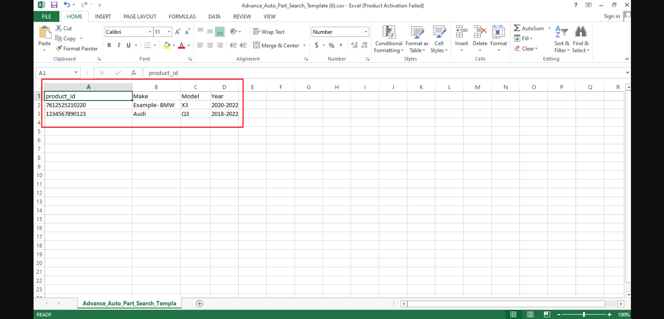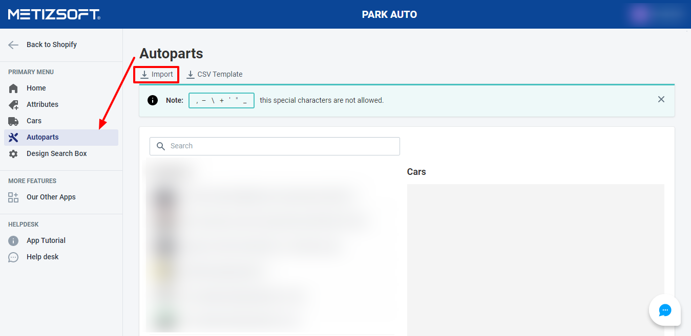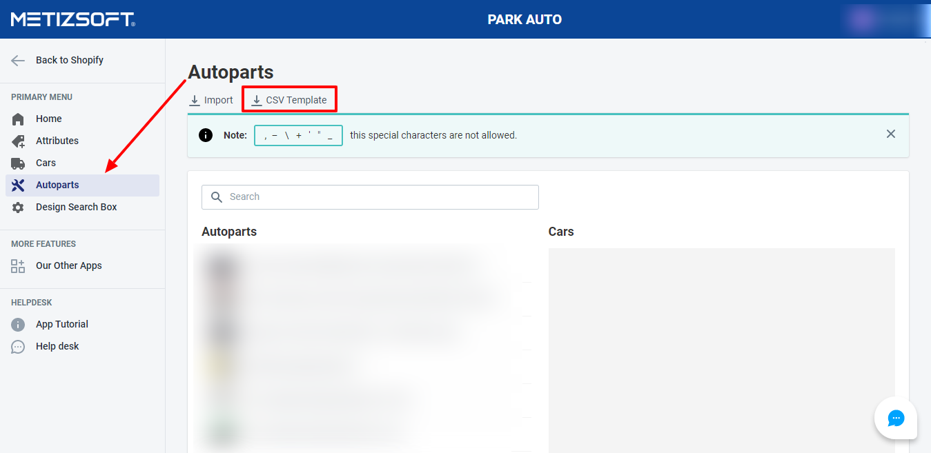 ● In the Autoparts section, click the CSV Template button and enter your data into the downloaded template file.