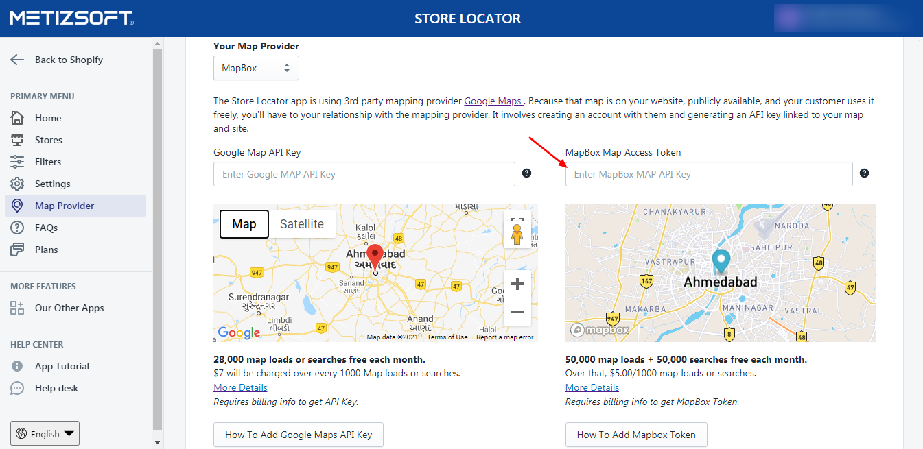 Go to Mapbox Signup and create your Mapbox account. You will be redirected to your Mapbox dashboard, where you can find and copy your Access Token. Paste your Mapbox Access Token into the Map Provider section of your Store Locator settings.