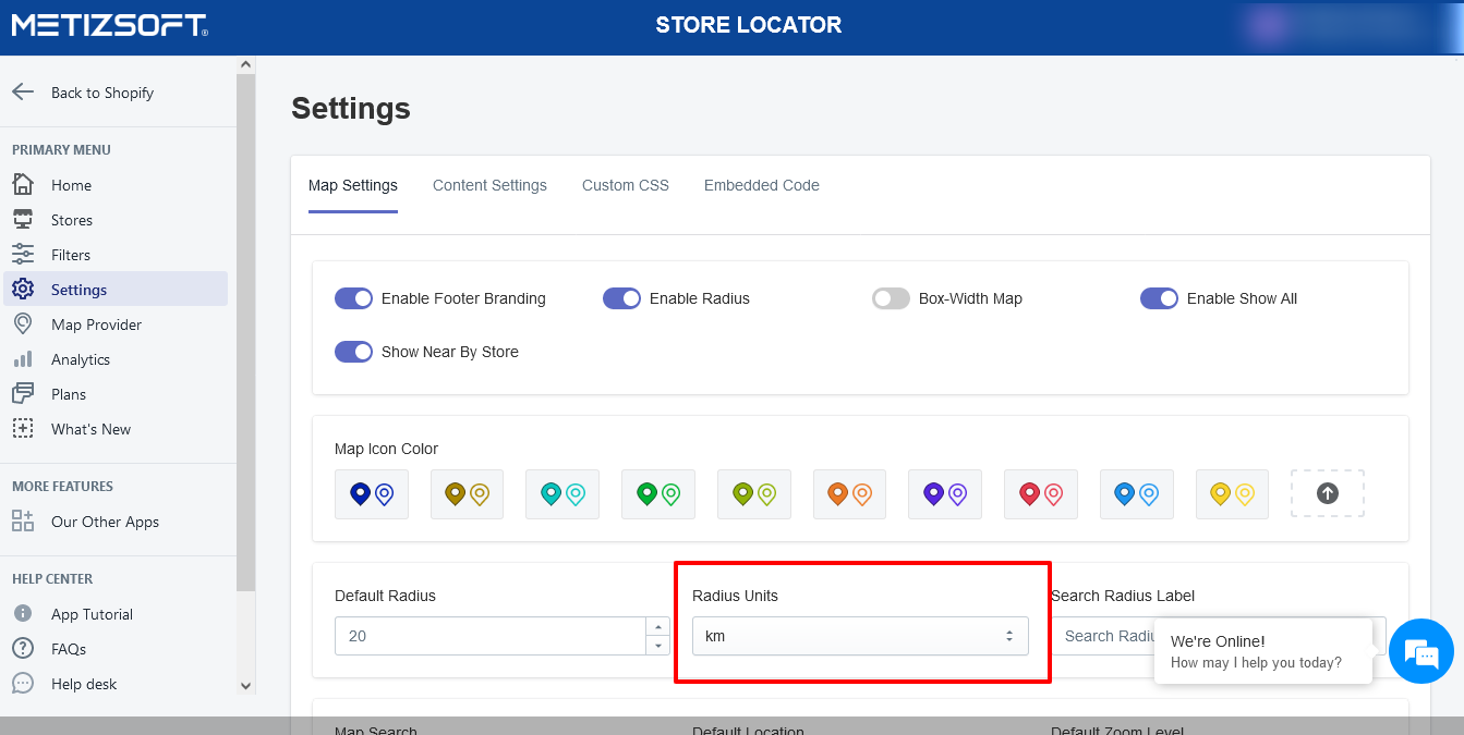 1. Go to App Settings. 2. Click on Map Settings. 3. In Map Settings, enable the Enable Radius option. 4. Once enabled, the Radius Units option will appear, allowing you to change the unit from KM to Miles. (Note: These features are available only in ...