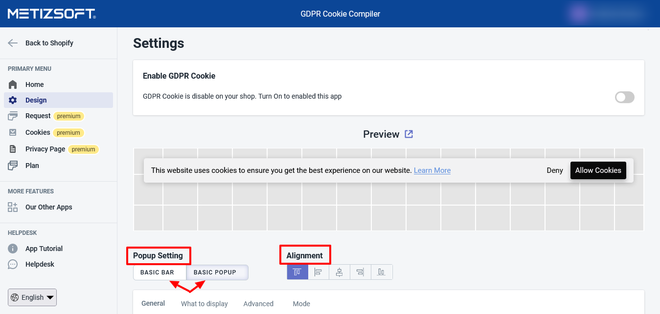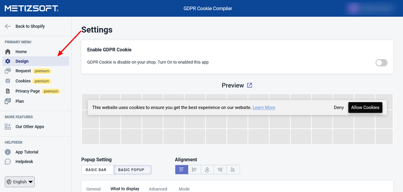 Consider following the below procedure to Enable/Disable Cookie Bar Pop up: Open the GDPR Cookie Compiler App and go to the "Design" page. Click on the Toggle Button on the top banner to enable or disable the banner.