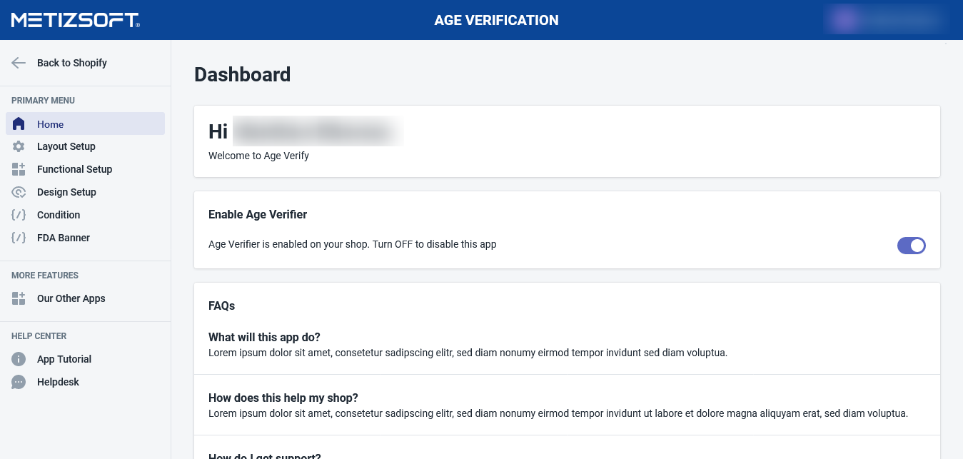 Open Age Verifier App. Go to the Layout setup, select popup backend layout from transparent or background. Go to the Functional Setup - set Age, visitors days, labels, and texts for a month, day, year, button, Validation message. Then click on the ...