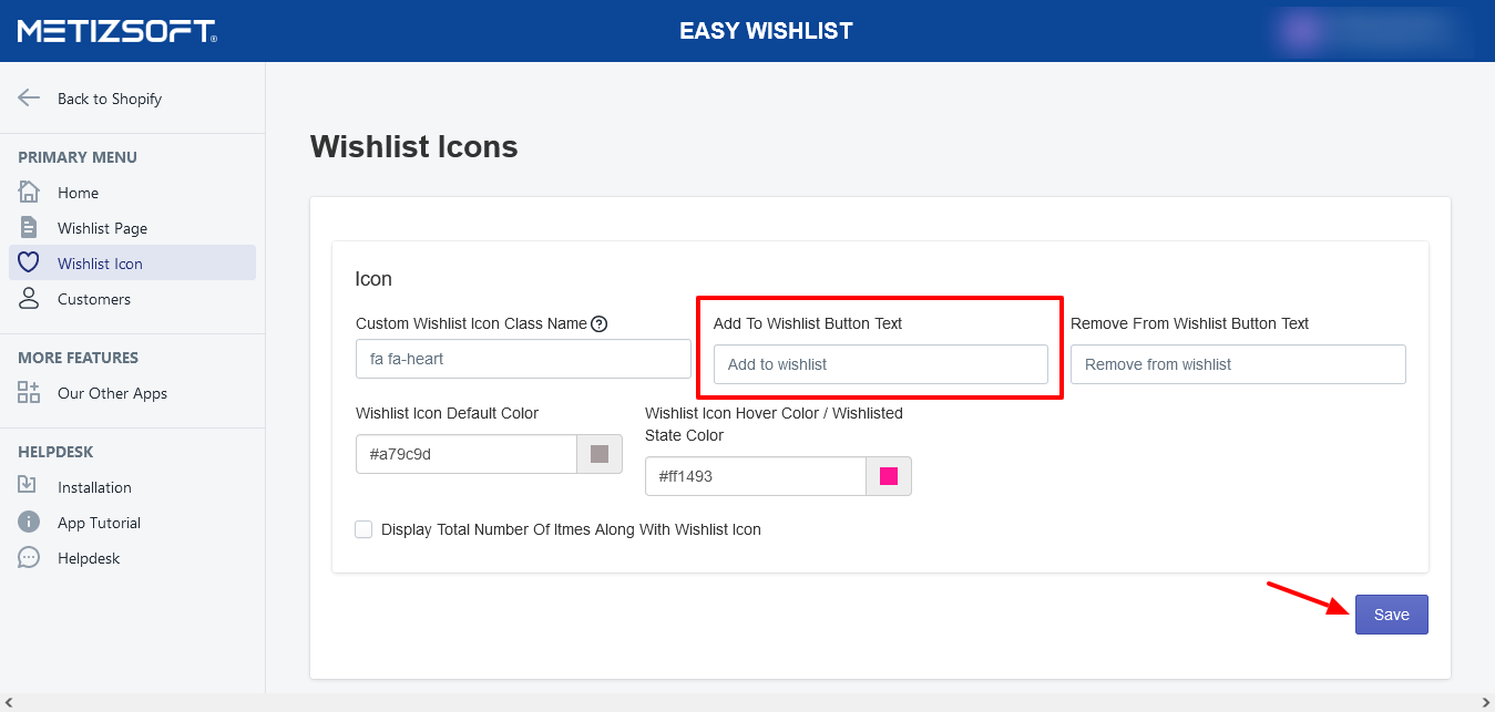 Open the Wishlist App and Go to the Wishlist Page. Set wishlist page text, button text, color and custom CSS, etc. Then click on the Save button.