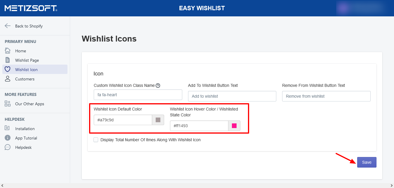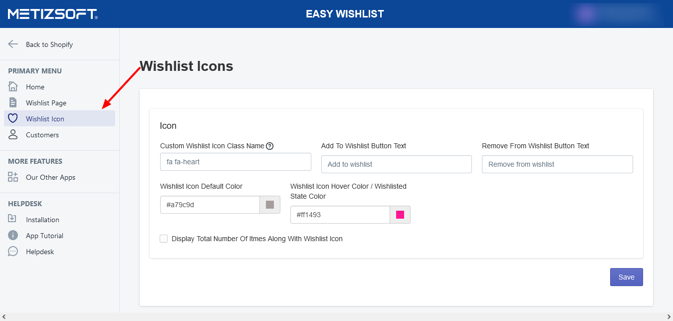 Open the Wishlist App and Go to the Wishlist Icons page Uncheck Display Total Number Of Items Along With Wishlist Icon checkbox. Then, Click on the Save button.