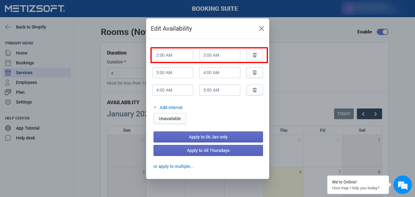 Open the Booking Suite app and Go to the "Employees" section. Click on the "Add Employee" button on the right side. Fill in the all form details. For the availability, click on the day in the calendar, and the Availability popup is open. Click on ...