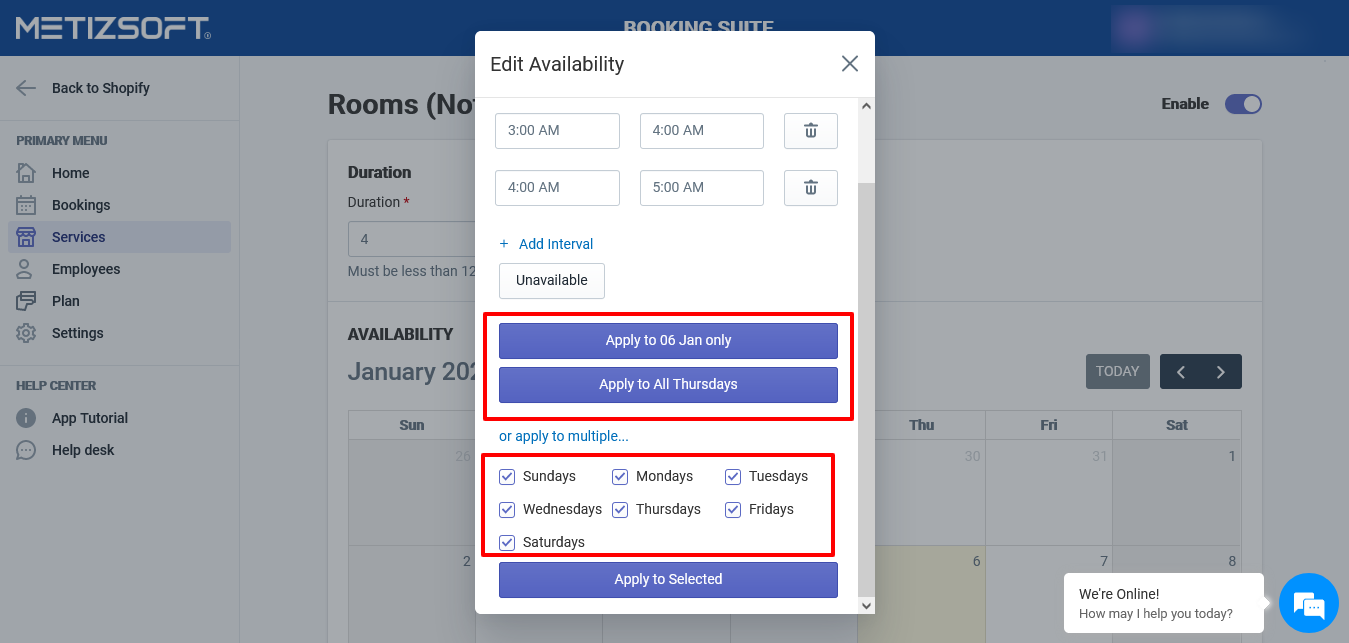 If you want to add same interval for more days then click on "or apply to multiple", select the days you want to apply the same interval. Click on "Apply to Selected".