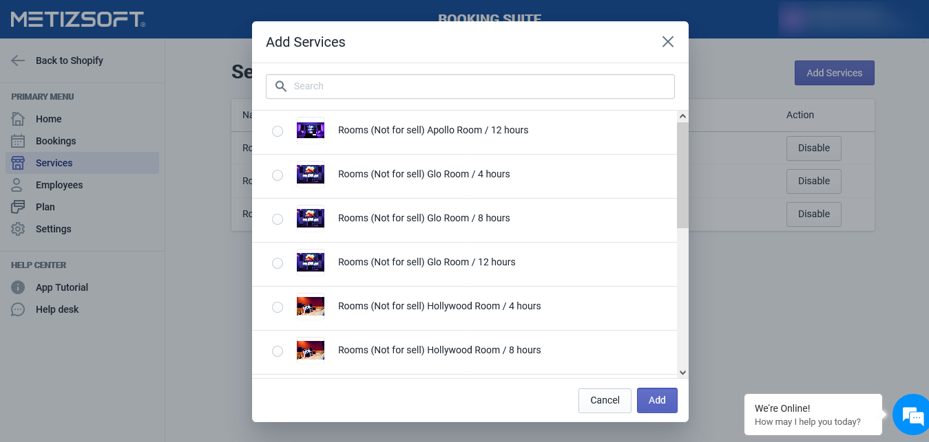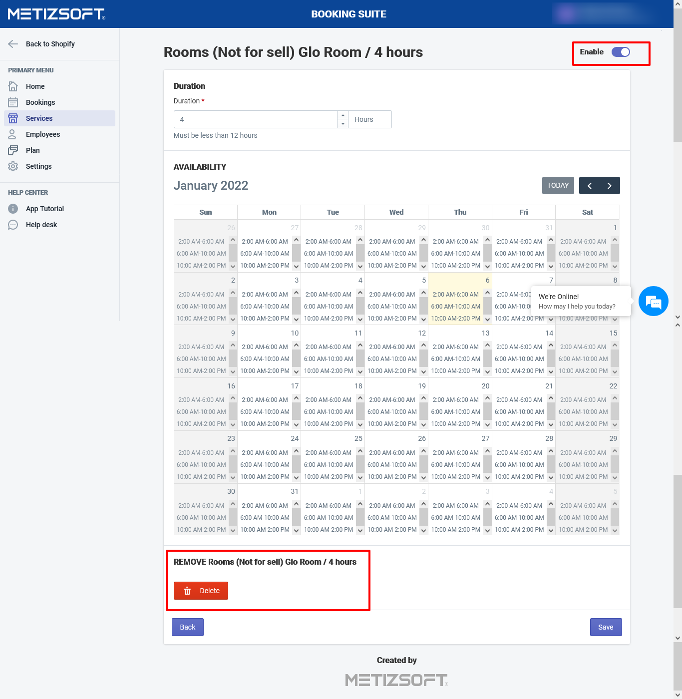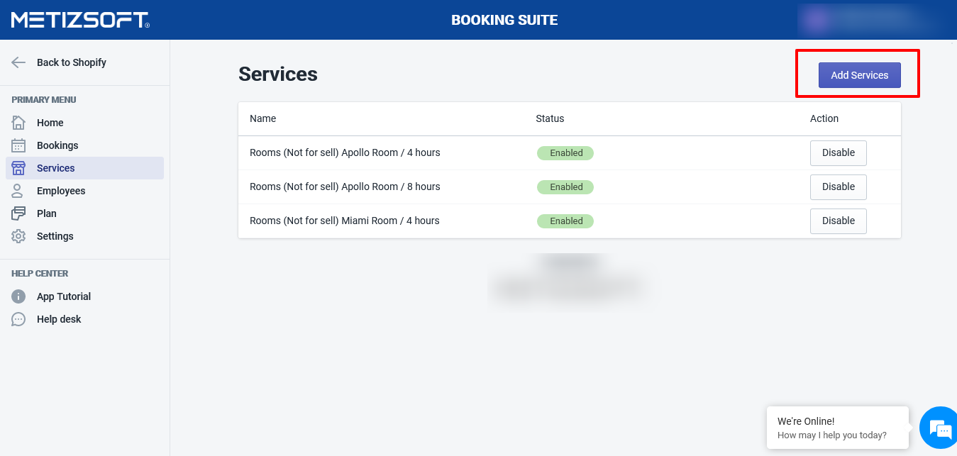 Open the Booking Suite app and Go to the "Services" section. Click on the "Disable" button on the right side of the service name.