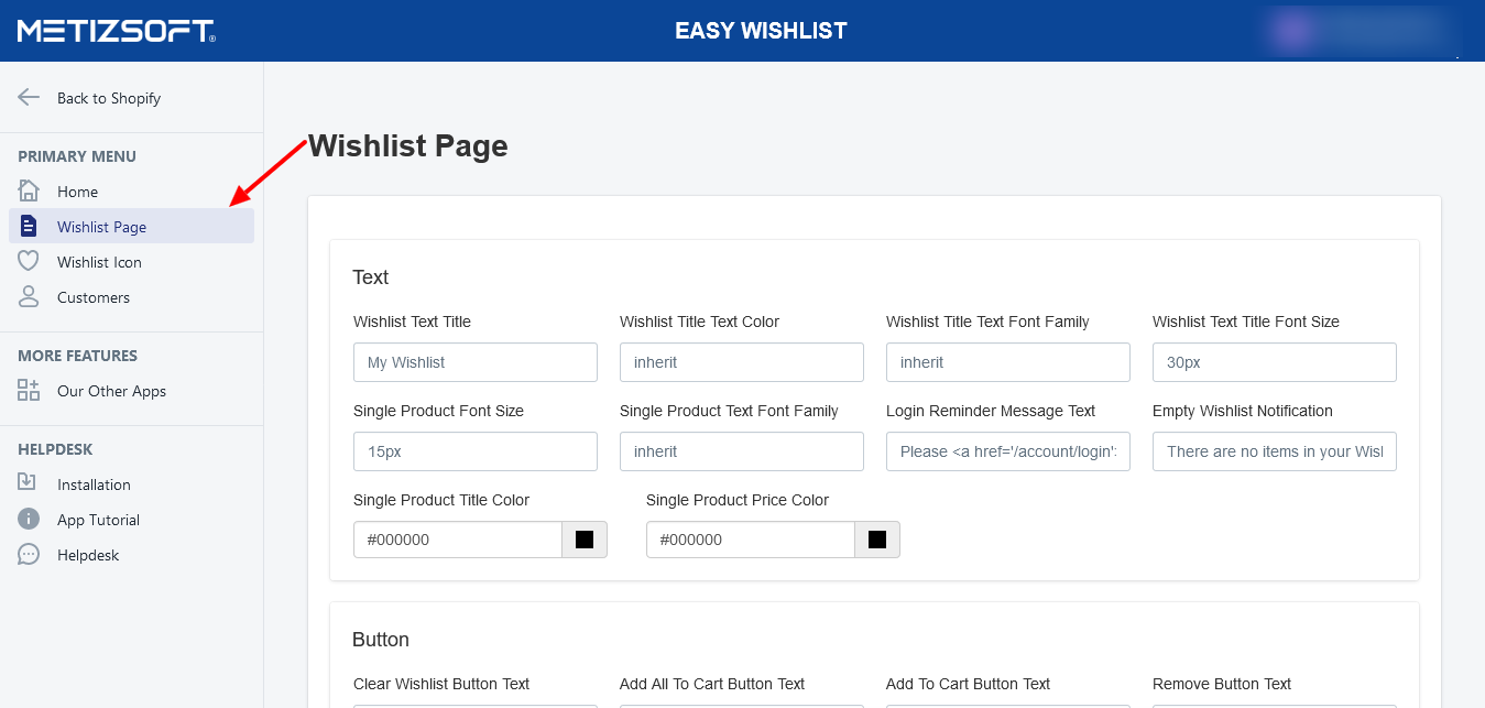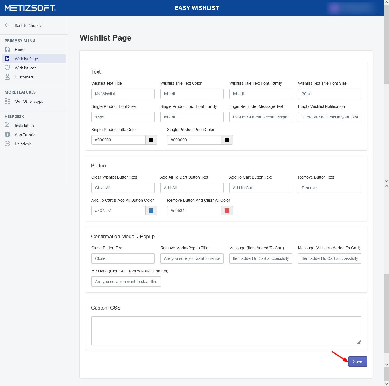 Open the Wishlist App and Go to the Wishlist Icons page Change Wishlist Icon "Default Color" and "Wishlist Icon Hover Color / Wishlisted State Color." Then click on the Save button.