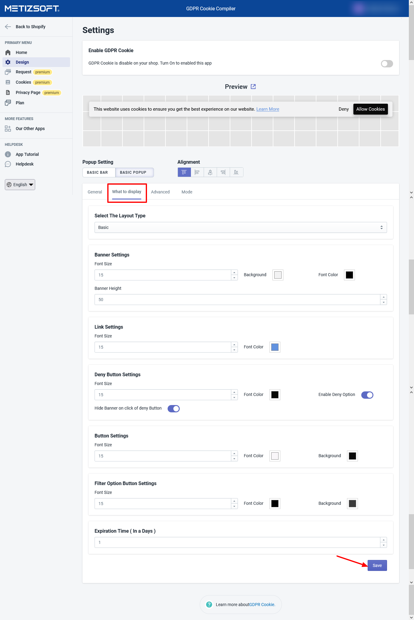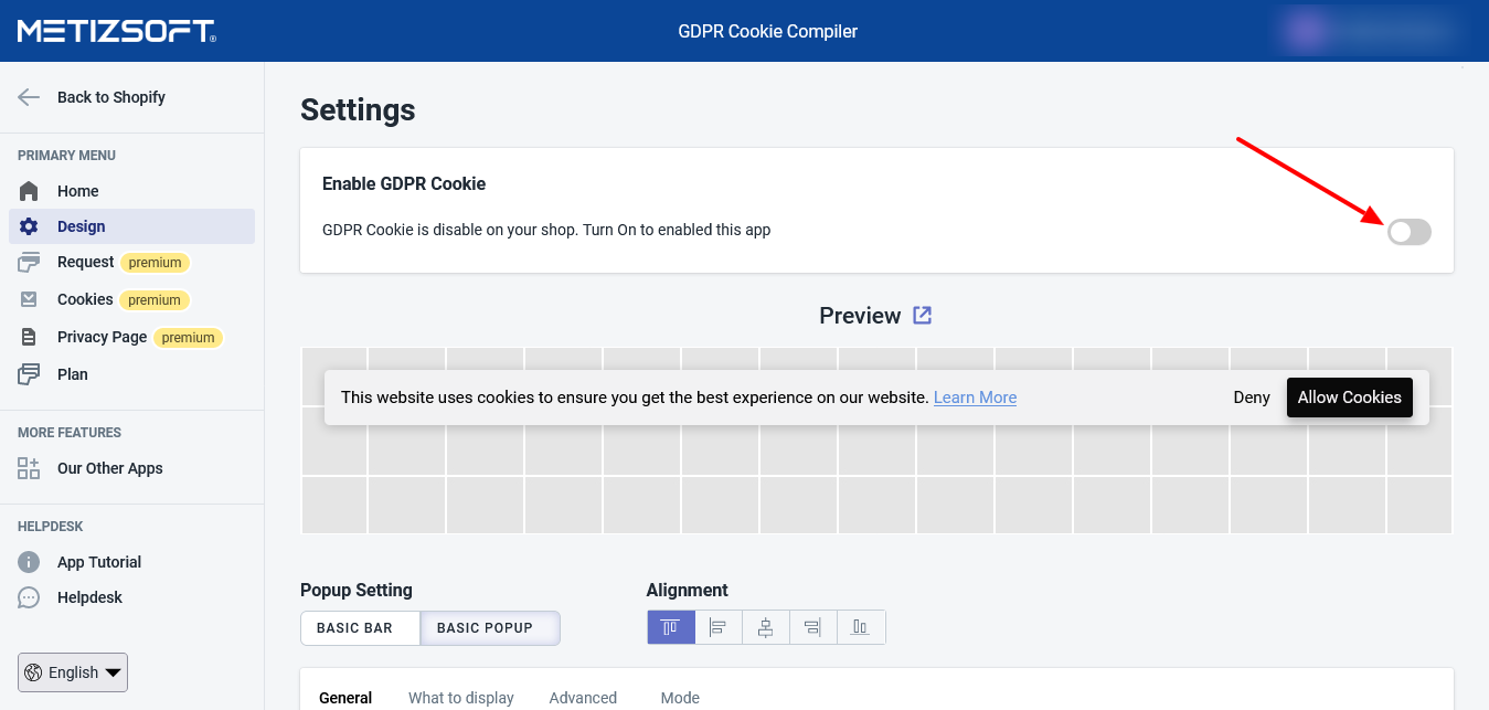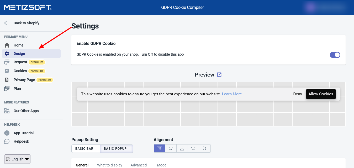 Consider following the below procedure to Enable/Disable Cookie Bar Pop up: Open the GDPR Cookie Compiler App and go to the "Design" page. Click on the Toggle Button on the top banner to enable or disable the banner.