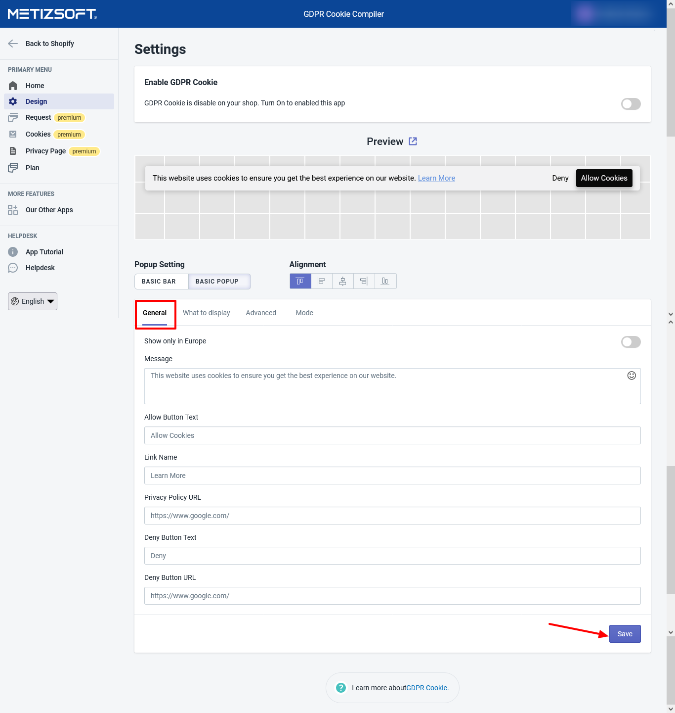 Follow the below procedure to set up a Cookie Bar for European countries: First, open the GDPR Cookie Compiler App and go to the "Design" page. In the General tab, enable "Show only in Europe." Click on the Save button from the bottom of the page.