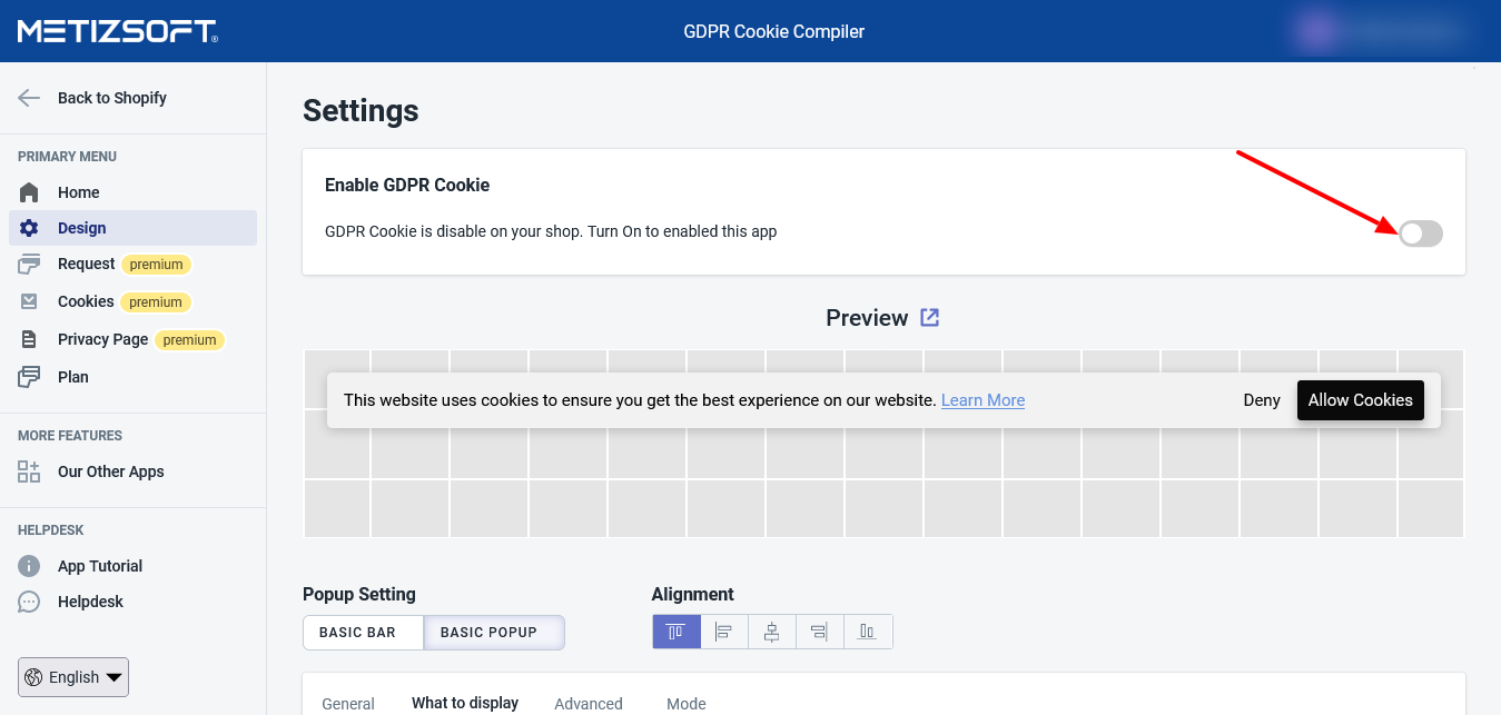 To change the Cookie Bar Alignment, you need to: Open the GDPR Cookie Compiler App and go to the “Design” page. Now, select Basic Bar or Basic Popup under "Popup Setting." And select the "Alignment" under the Alignment.