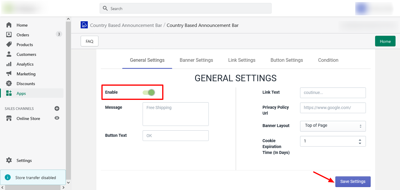 Open Country Based Announcement Bar App In the General Setting tab, set Message, Link Text, Button Text, Privacy Policy Url, Cookie Expiration, and click on the "Save Setting" button. In the Banner setting, set banner Color, Font size, and click on ...