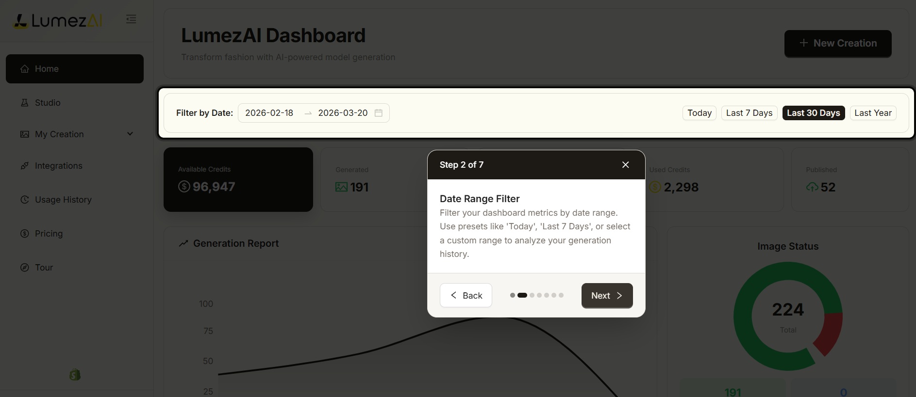 The date range filter at the top of your dashboard controls all the metrics you see — including images generated, downloads, used credits, and published items. Filtering by date helps you understand your activity over any specific period.