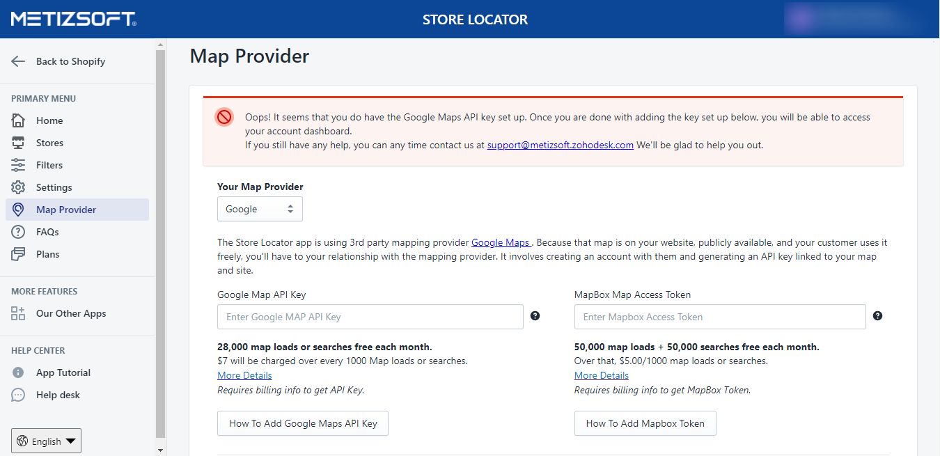 14. You’re all set! Your Google Maps API key is now ready. Go back to the Credentials page, copy your API key, then log in to your Store Locator account. Navigate to the Map Provider tab, paste the key into the Google Maps API Key field, and click SAVE.