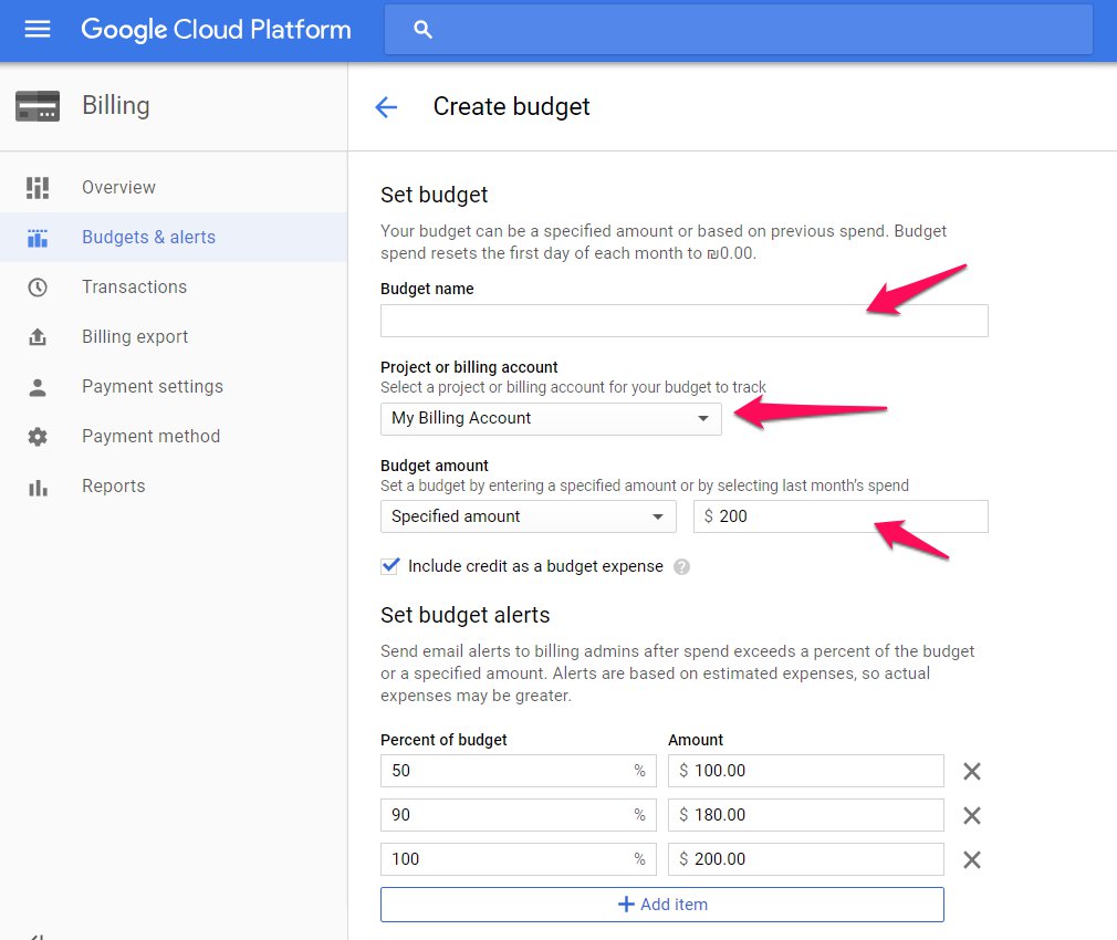 Set the Budget Amount. To stay within Google’s free credits, you can set it to $200.