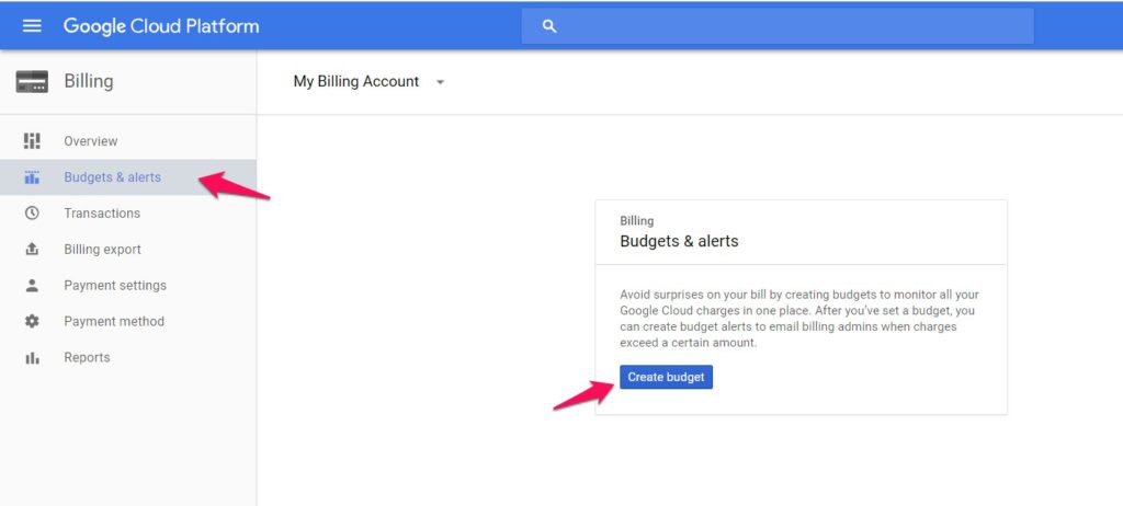 - On the left menu, click Budgets & Alerts, then click Create Budget on the right.