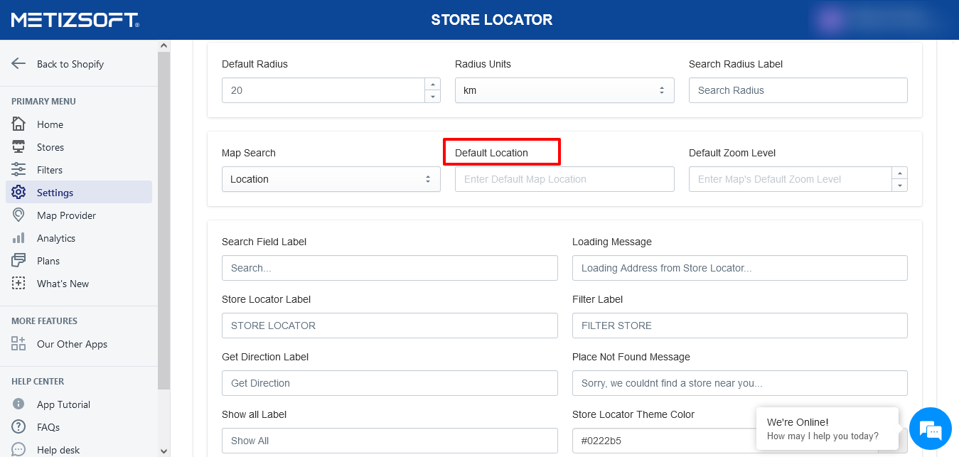 1. Go to App Settings. 2. Click on Map Settings. 3. Under Map Settings, click on Default Location and add your desired location(s).