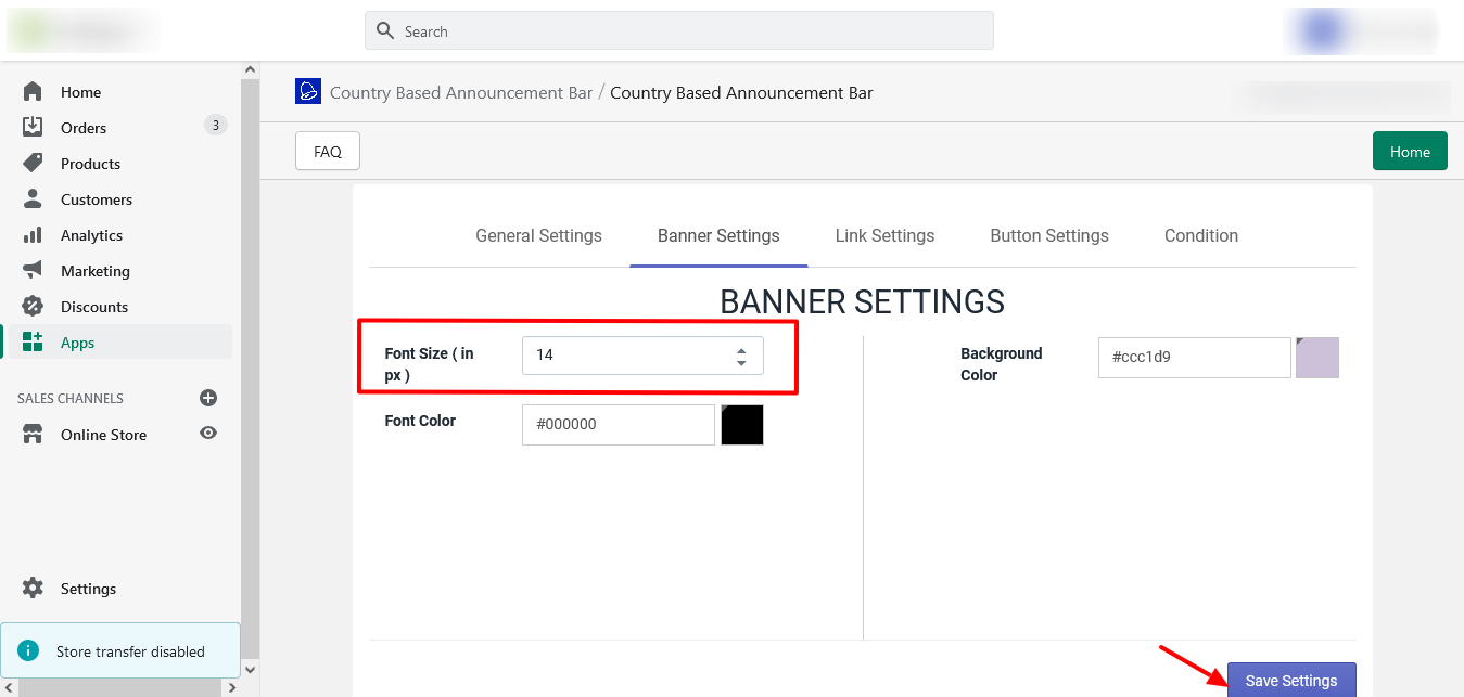 Open Country Based Announcement Bar App In the General Setting tab, set Message, Link Text, Button Text, Privacy Policy Url, Cookie Expiration, and click on the "Save Setting" button. In the Banner setting, set banner Color, Font size, and click on ...