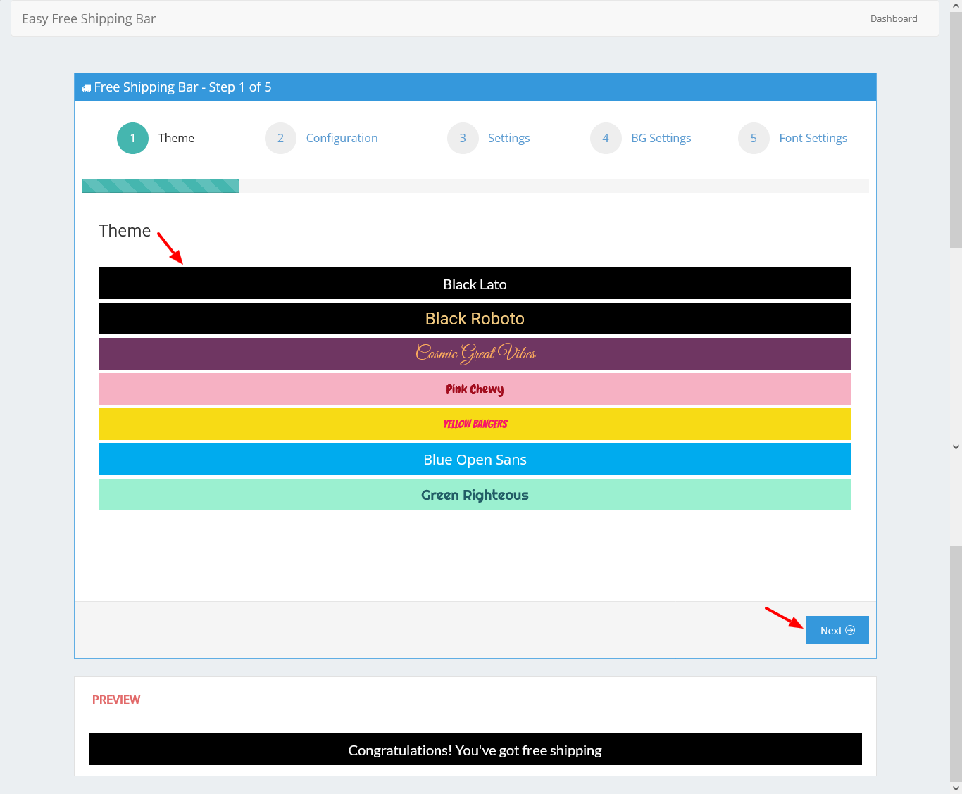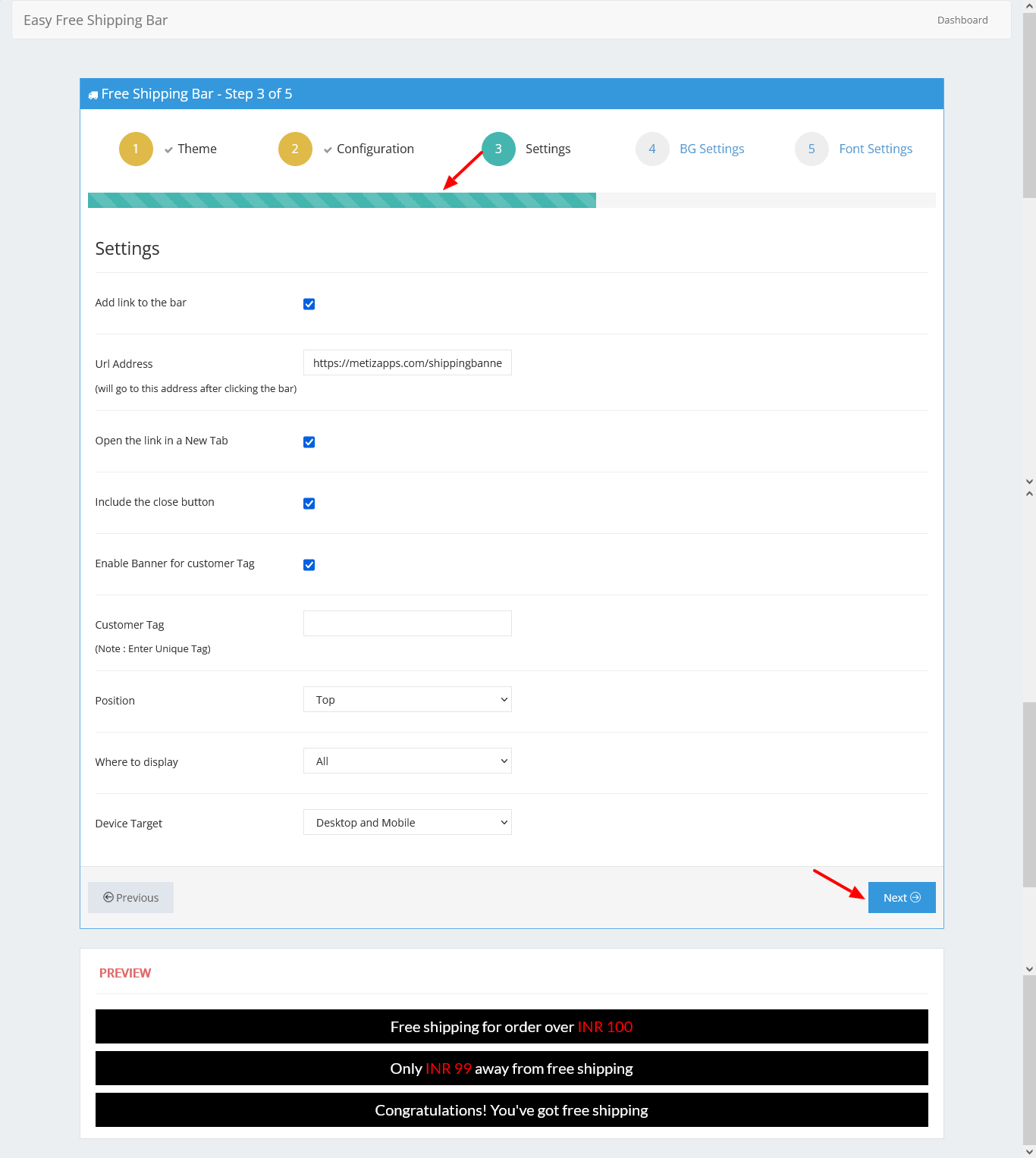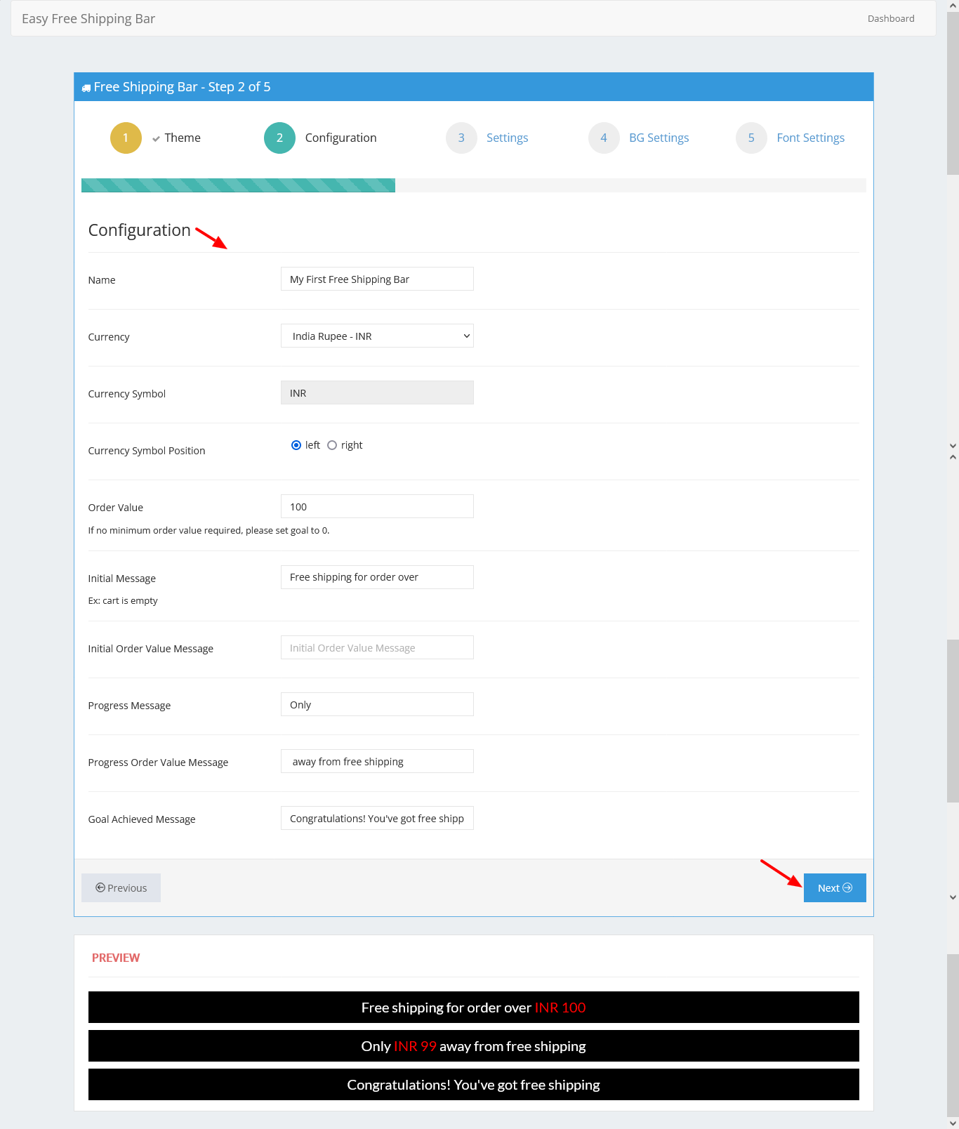 In the Configuration tab, Add Shipping Bar Name, select Currency, add order value and set text in the message. then click on the Next button.