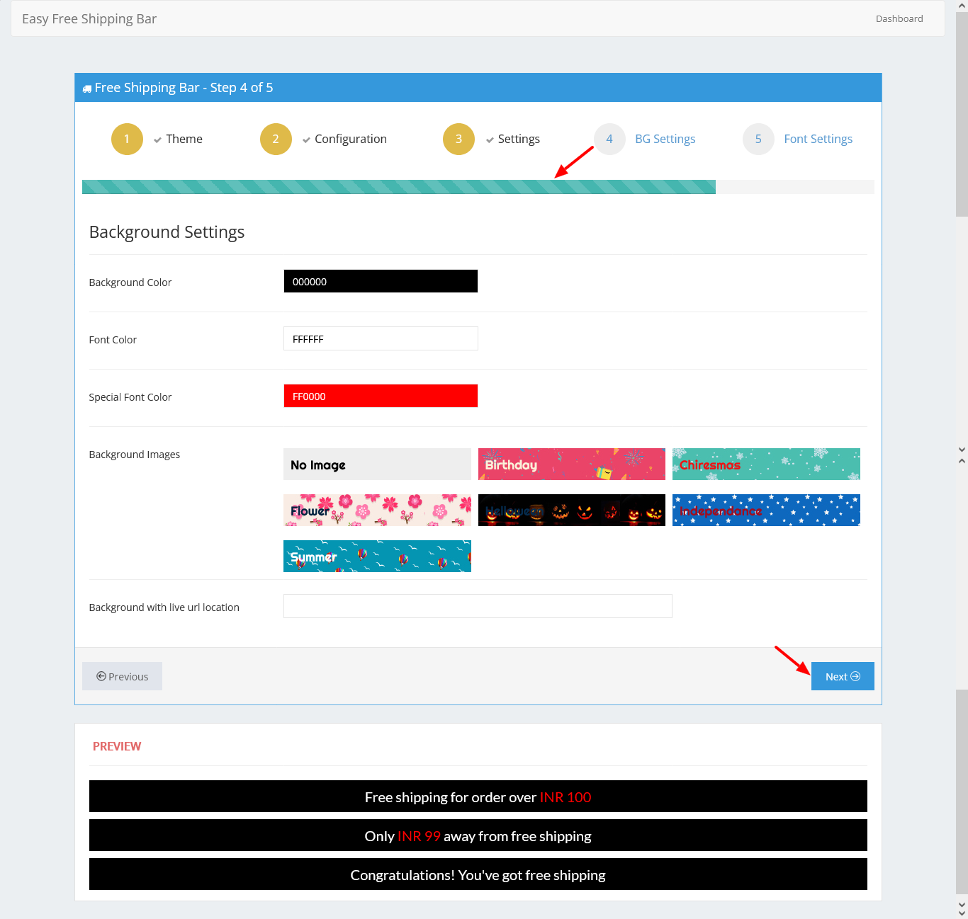 In BG Settings, set background color, font color, special font color, Background Images for bar, and click on Next button.
