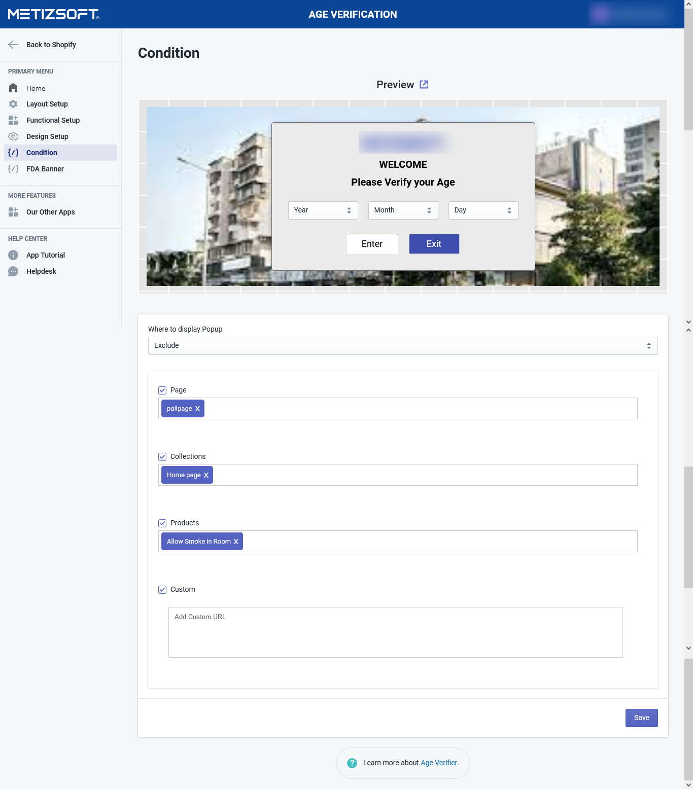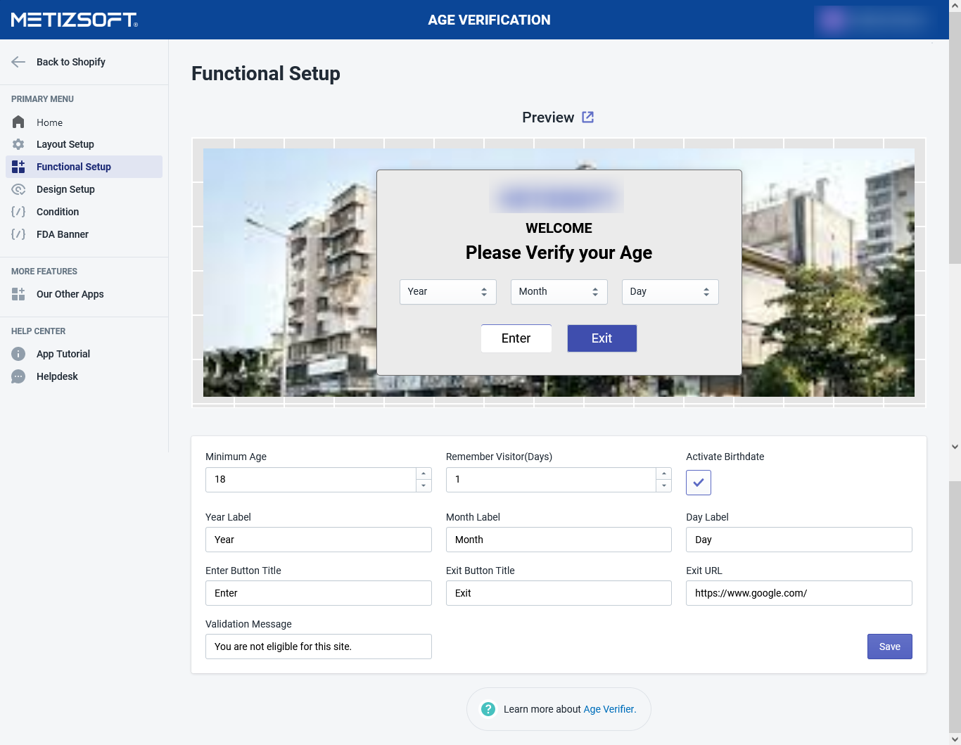 Go to the Functional Setup - set Age, visitors days, labels, and texts for a month, day, year, button, Validation message.