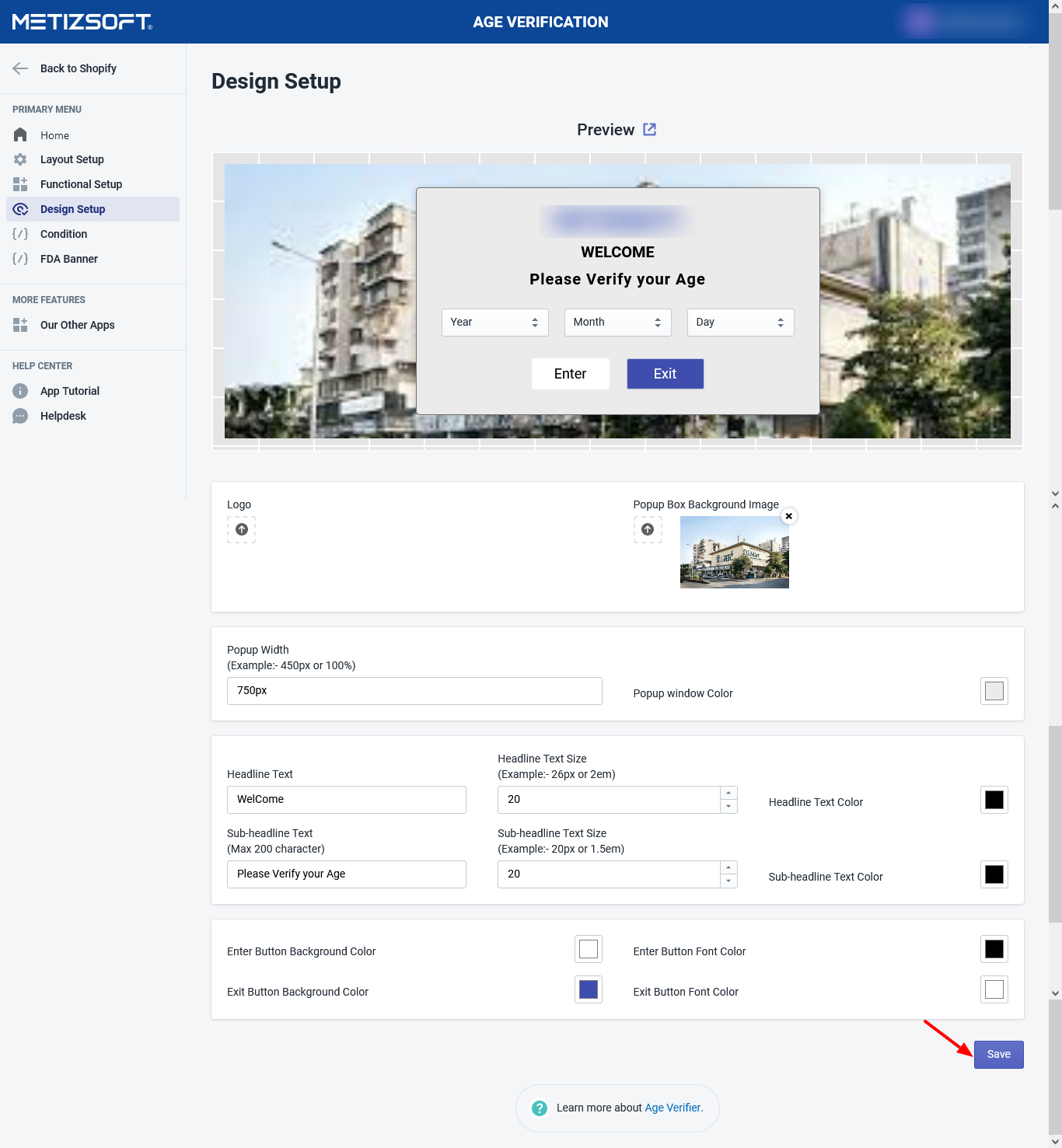 Now, go to the Design Setup - upload logo, upload background image, set Popup Width, set headline and sub-headline text, button background color, etc.