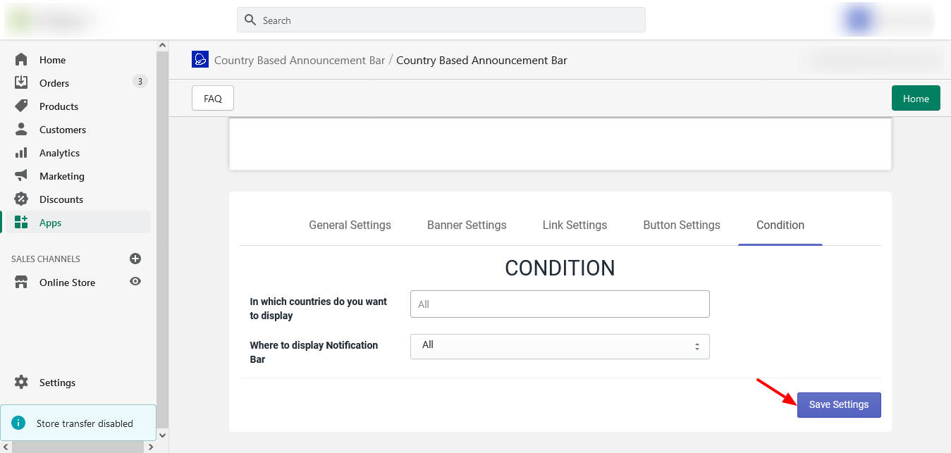 In the Condition tab, select the countries you want to show the notification bar. Also, select where you want to show the notification bar on your site from the page, products, collections, and custom link, and the default bar will show on all pages on your site.