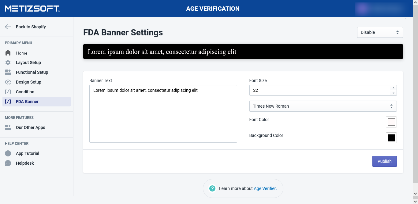 Open Age Verifier App. Go to the Layout setup, select popup backend layout from transparent or background. Go to the Functional Setup - set Age, visitors days, labels, and texts for a month, day, year, button, Validation message. Then click on the ...
