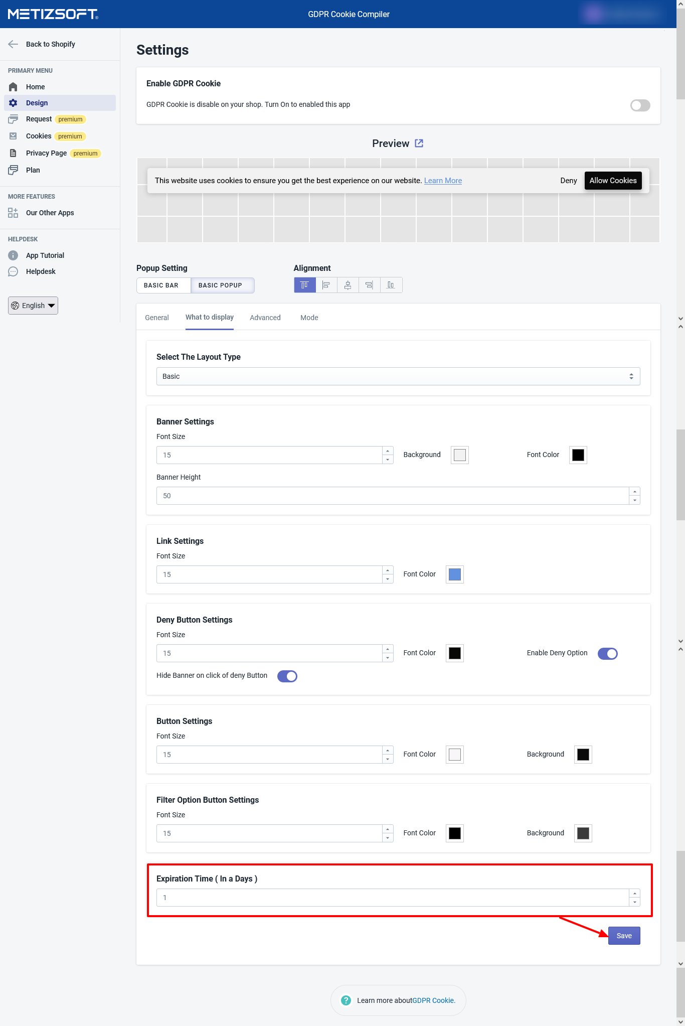 To Design the Cookie Bar Pop up, you need to: Open the GDPR Cookie Compiler App and go to the "Design" page. Set the Cookie Message and Button Text in the General tab and Save it. In the "What to display" tab, set the Color, Font Size of the text, ...